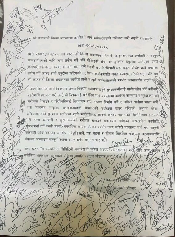‘न्यायपालिका जस्तो संवेदनशील क्षेत्रमा दिनरात अहोरात्र खट्ने सुरक्षाकर्मीलाई गालीगलौज गर्दै बर्दीधारी प्रहरीमाथि हातपात गरी उल्टै सो विषयलाई अतिरञ्जित गरी अदालतमा कार्यरत कर्मचारी र सुरक्षाकर्मीको मनोबल गिराउने र परिस्थितिलाई विषयान्तर गरी तरलता निर्माण गर्ने र धमिलो पानीमा माछा मार्ने गरी विकसित पछिल्ला घटनाक्रमहरूले अदालतको मर्यादामा प्रहार गरिएको अनुभव गरेका छौँ । अदालतको सुरक्षामा खटिएका प्रहरी कर्मचारीलाई आफ्नो कर्तव्य पालनाको सिलसिलामा हातपात गरी समग्र कर्मचारी र सुरक्षाकर्मीको मनोबल घटाउने मनसायले गरिएको आपराधिक कार्यप्रति घोर भर्त्सना गर्दै यस्तो गल्ती/आपराधिक कार्यमा संलग्न व्यक्ति उपर जाहेरी दरखास्त दर्ता गरी कानुनी कारबाही अघि बढाउन अनुरोध गर्दछौँ । साथै, यस घटना र सोबाट विकसित पछिल्ला घटनाक्रमप्रति संयमता अपनाउन सम्पूर्ण पक्षमा ध्यानाकर्षण गराउन चाहन्छौँ ।’
