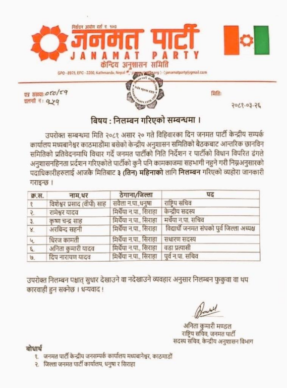 काठमाडौं । जनमत पार्टीले सचिवसहित ७ जनालाई निलम्बन गरेको छ । डा.सीके राउत नेतृत्वको जनमत पार्टीले सात जना नेतालाई तीन महिना निलम्बनको कारबाही गरेको हो ।