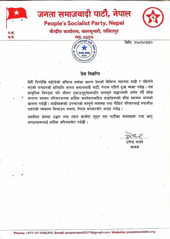 काठमाडौं । जनता समाजवादी पार्टी नेपालले केही दिनदेखि भइरहेको अविरल वर्षाका कारण देशको विभिन्न स्थानमा बाढी पहिरोले भएको जनधनको क्षतिप्रति दुःख व्यक्त गरेको छ ।