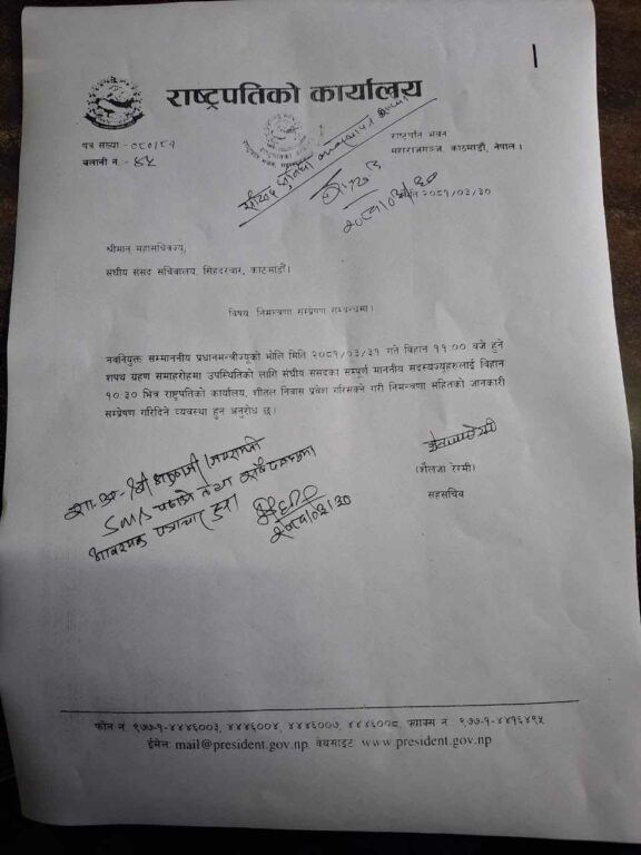 राष्ट्रपति कार्यालयले संसद सचिवालयलाई पठाएको पत्रमा भनिएको छ, ‘नवनियुक्त सम्माननीय प्रधानमन्त्रीज्यूको भोलि मिति २०८१/३/३१ गते बिहान ११ बजे हुने शपथ ग्रहण समारोहमा उपस्थितिको लागि संघीय संसदका सम्पूर्ण माननीय सदस्यज्यूहरूलाई बिहान १०ः३० भित्र राष्ट्रपतिको कार्यालय, शीतल निवास प्रवेश गरिसक्ने गरी निमन्त्रणा सहितको जानकारी सम्प्रेषण गरिदिने व्यवस्था हुन अनुरोध छ।’
