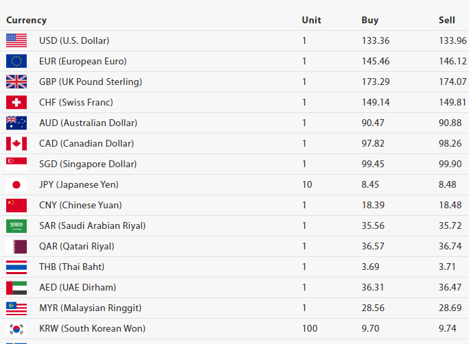 राष्ट्र बैंकका अनुसार आज अमेरिकी डलर एकको खरिद दर १३३.३६ रुपैयाँ रहेको छ भने बिक्री दर १३३.९६ रुपैयाँ रहेको छ ।