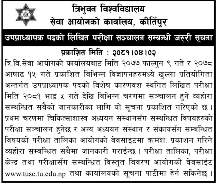 त्रिभुवन विश्वविद्यालयको आयोगको कार्यालयबाट मिति २०७७ फागुन ९ गते र २०७८ असारमा १५ गते प्रकाशित विज्ञापनको लिखित परीक्षा २०८१ भाद्र ५ गते देखि सुरु हुन लागेको हो ।