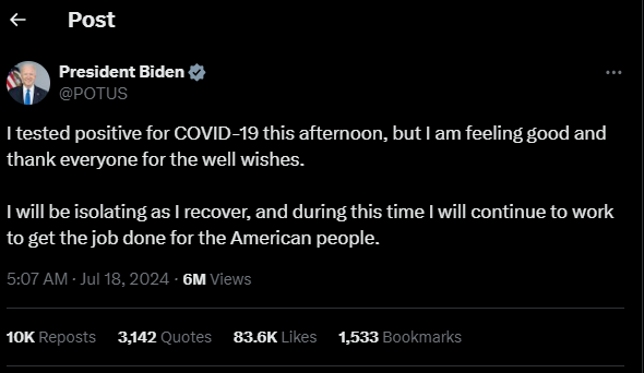 अमेरिकी राष्ट्रपतिको आधिकारिक एक्स ह्यान्डलबाट पनि बाइडेनलाई कोरोना पुष्टि भएको जानकारी दिइएको छ ।