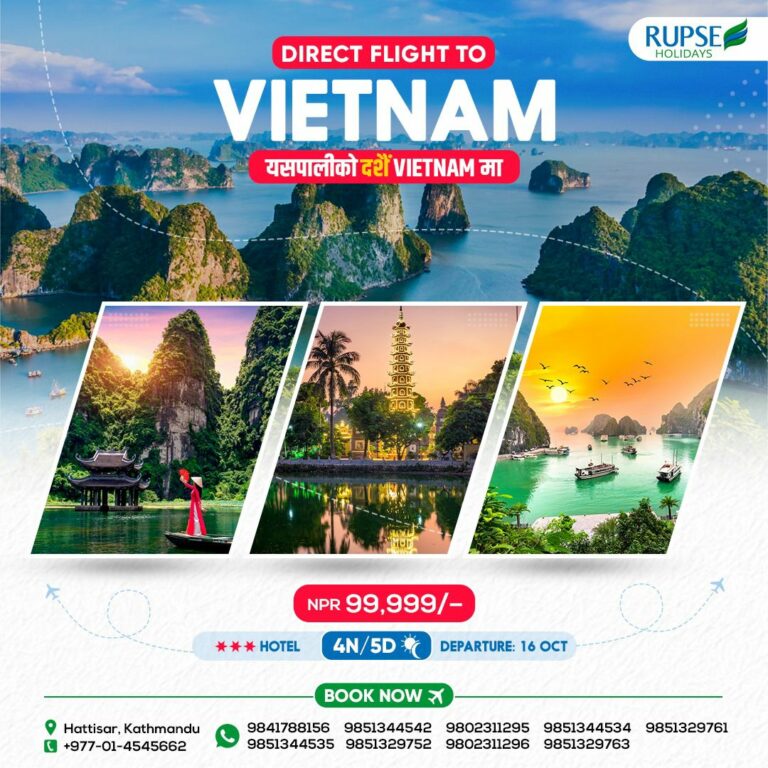 काठमाडौं । रुप्से होलिडेजले एक लाख रुपैयाँ मै ५ दिनको भियतनाम भ्रमणको योजना सार्वजनिक गरेको छ । चार्टर फ्लाइटमार्फत उडान भर्ने गरी रुप्सेले यस्तो योजना ल्याएको हो ।