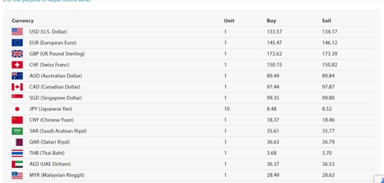 राष्ट्र बैंकका अनुसार आज अमेरिकी डलर एकको खरिद दर १३३ रुपैयाँ ५७ पैसा र बिक्री दर १३४ रुपैयाँ १७ पैसा पुगेको छ ।