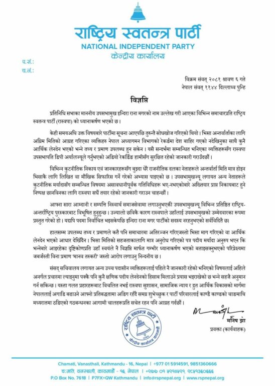 काठमाडौं । अमेरिकी दूतावासलाई लेखेको पत्र सार्वजनिक भएपछि विवादमा तानिएकी उपसभामुख इन्दिरा रानाबारे राष्ट्रिय स्वतन्त्र पार्टी (रास्वपा) ले बचाउ गरेको छ ।
