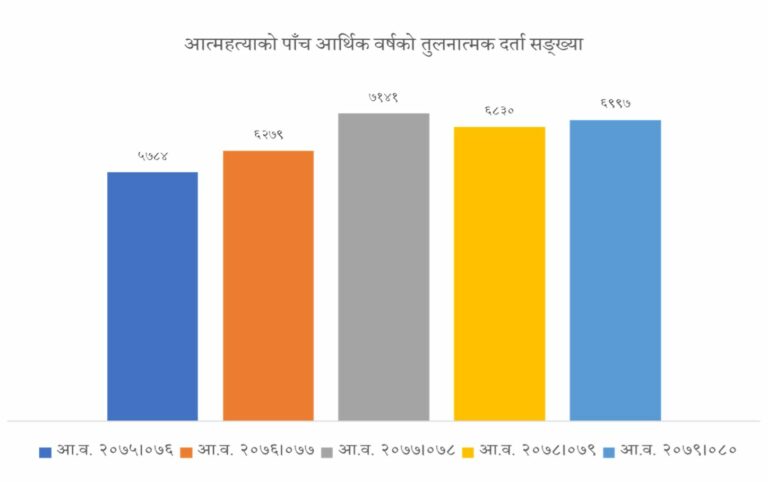 त्यसैगरी आर्थिक वर्ष २०७७।०७८ मा आत्महत्या गर्नेको सङ्ख्या बढेर ७ हजार १४१ जना पुगेको पाइएको छ । आर्थिक वर्ष २०७८।०७९ मा भने त्यसमा केही घट्दै ६ हजार ८३० जनाले आत्महत्या गरेकामा आर्थिक वर्ष २०७९।०८० मा पुनः वृद्धि भई ६ हजार ९९७ जनाले आत्महत्या गरेको पाइएको छ ।
