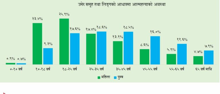 त्यसैगरी १० देखि १८ वर्षको आत्महत्याको दर हेर्दा २५ दशमलव ९ प्रतिशत महिला र १७ दशमलव ६ प्रतिशत पुरुषले आत्महत्या गरेको पाइएको छ ।