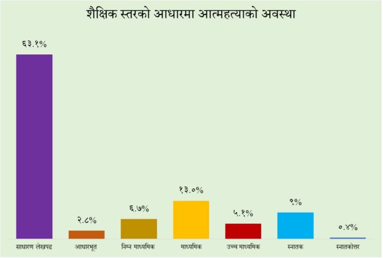 विगत ५ वर्षको आत्महत्याको तथ्याङ्क केलाउँदा आत्महत्या गरेर ज्यान फाल्नेमध्ये ६३ दशमलव एक प्रतिशत व्यक्ति साधारण लेखपढ मात्रै गर्न जान्ने रहेको पाइएको छ । आत्महत्या गर्नेमध्ये आधारभूत शिक्षा लिएका २ दशमलव ८ प्रतिशत, निम्न माध्यमिक शिक्षा लिएका ६ दशमलव ७ प्रतिशत, माध्यमिक शिक्षा लिएका १३ प्रतिशत, उच्च माध्यमिक शिक्षा लिएका ५ दशमलव १ प्रतिशत, स्नातक अध्ययन गरेका ९ प्रतिशत र स्नातकोत्तर अध्ययन गरेका शून्य दशमलव ४ प्रतिशतले आत्महत्या राजेको पाइएको छ । अध्ययनले अनपढ वा साधारण लेखपढ गर्नेहरूले बढी आत्महत्या गरेको पाइएको हो ।