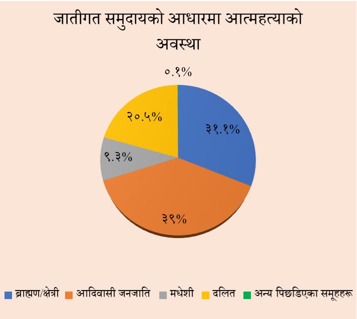 प्रहरीको तथ्याङ्क अनुसार आत्महत्या गर्नेहरूमध्ये ३९ प्रतिशत जनसङ्ख्या आदिवासी जनजातिको रहेको छ । त्यस्तै ३१ दशमलव १ प्रतिशत ब्राम्हण क्षेत्री, २० दशमलव ५ प्रतिशत दलित र ९ दशमलव ३ प्रतिशत मधेसका रहेका छन् ।
