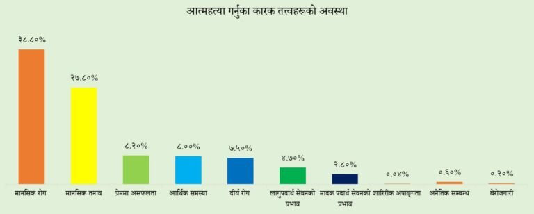 प्रहरीको तथ्याङ्क अनुसार आत्महत्या गर्नेमध्ये ६५ प्रतिशत मानिसहरू कुनै न कुनै मानसिक समस्यामा रहेको पाइएको छ । आत्महत्या गर्नेमध्ये ३८ दशमलव ८ प्रतिशत मानसिक रोगी रहेका छन् भने २७ दशमलव ८ प्रतिशत मानसिक तनावमा रहेका व्यक्तिहरू छन् । त्यसैगरी ८ दशमलव २ प्रतिशतले प्रेममा असफलताका कारण आत्महत्या गरेका छन् भने ८ प्रतिशतले आर्थिक समस्याका कारण आत्महत्या गरेका छन् ।