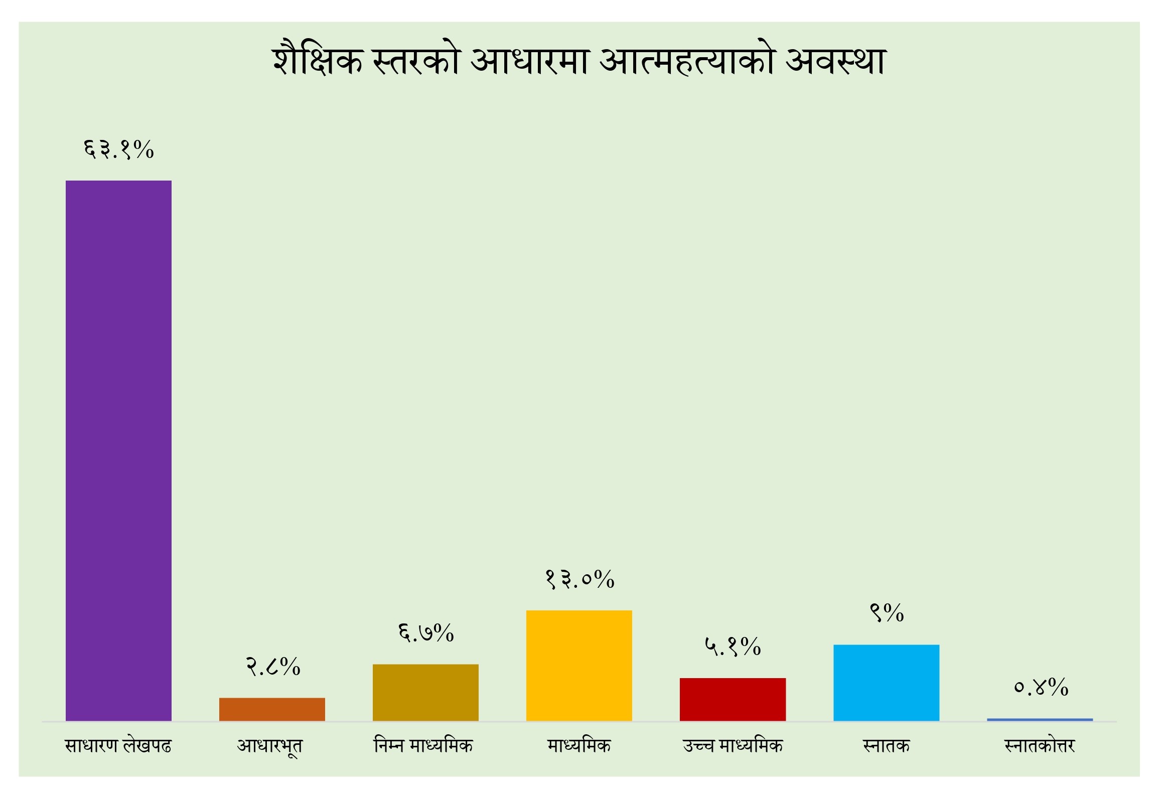 विगत ५ वर्षको आत्महत्याको तथ्याङ्क केलाउँदा आत्महत्या गरेर ज्यान फाल्नेमध्ये ६३ दशमलव एक प्रतिशत व्यक्ति साधारण लेखपढ मात्रै गर्न जान्ने रहेको पाइएको छ । आत्महत्या गर्नेमध्ये आधारभूत शिक्षा लिएका २ दशमलव ८ प्रतिशत, निम्न माध्यमिक शिक्षा लिएका ६ दशमलव ७ प्रतिशत, माध्यमिक शिक्षा लिएका १३ प्रतिशत, उच्च माध्यमिक शिक्षा लिएका ५ दशमलव १ प्रतिशत, स्नातक अध्ययन गरेका ९ प्रतिशत र स्नातकोत्तर अध्ययन गरेका शून्य दशमलव ४ प्रतिशतले आत्महत्या राजेको पाइएको छ । अध्ययनले अनपढ वा साधारण लेखपढ गर्नेहरूले बढी आत्महत्या गरेको पाइएको हो ।