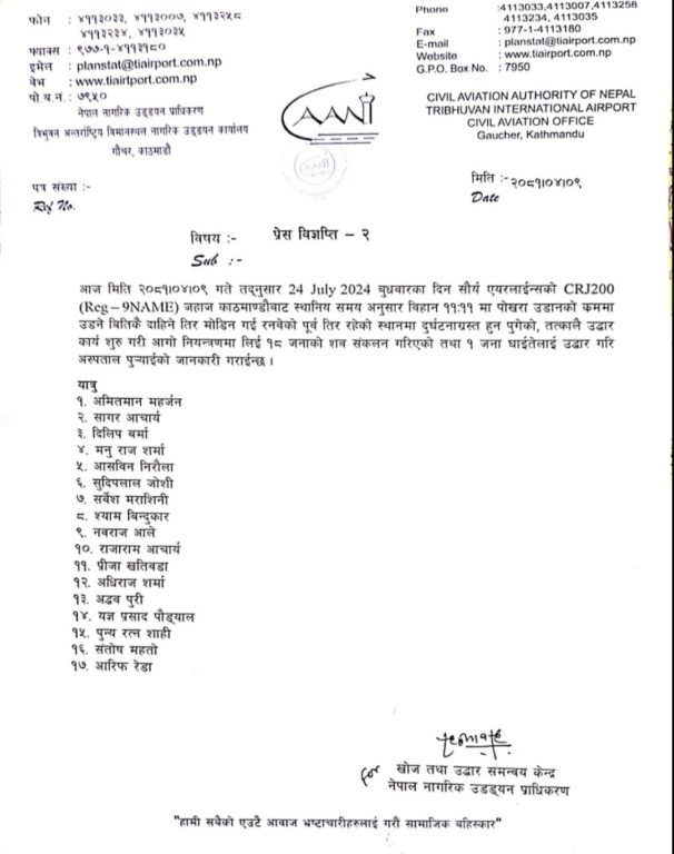 नागरिक उड्डयन प्राधिकरण (क्यान) का अनुसार मृत्यु हुने विदेशी नागरिकमा यमनका आरिफ रेडा रहेका छन् । त्यसबाहेक मृत्यु भएका सबै नेपाली हुन् ।