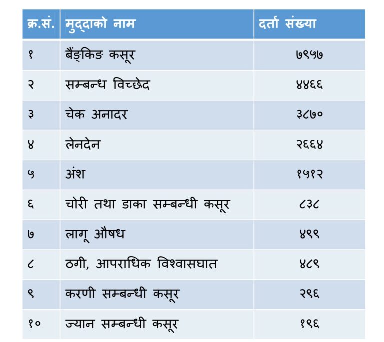 सबैभन्दा बढी मुद्दा बैंकिङ कसुरका, दोस्रोमा सम्बन्ध विच्छेद