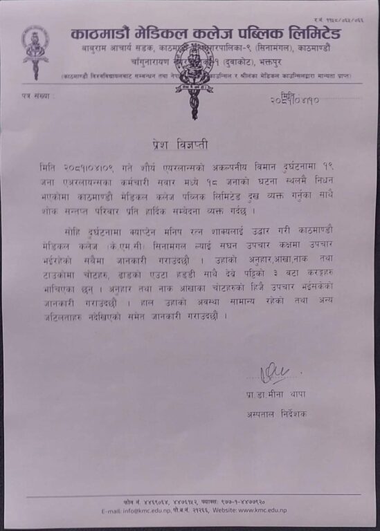 काठमाडौं । बुधबार सौर्य एयरको विमान दुर्घटनामा घाइते पाइलट (क्याप्टेन) मनिषरत्न शाक्यको अवस्था सामान्य रहेको छ ।