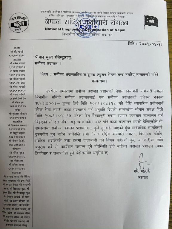 ‘…आज पनि कक्षा सञ्चालन भएको देखिएकाले सो सम्बन्धमा सर्वोच्च अदालत प्रशासनबाट कुनैपनि सुनुवाइ नभएको हुँदा सार्वजनिक सम्पत्तिलाई दुरुपयोग हुन नदिन आजैदेखि हामी नेपाल राष्ट्रिय कर्मचारी संगठन विभागीय समिति, सर्वोच्च अदालतले उक्त हलमा तालाबन्दी गर्ने निर्णय गरिएको कुरा जानकारीका लागि अनुरोध गर्दै सो कार्यबाट उत्पन्न हुने परिस्थितिप्रति सर्वोचच अदालत प्रशासन स्वयम जिम्मेवार र जवाफदेही हुने व्यहोरा समेत अनुरोध छ,’ जारी विज्ञप्तिमा भनिएको छ ।
