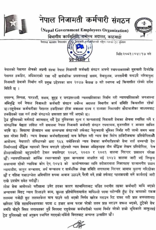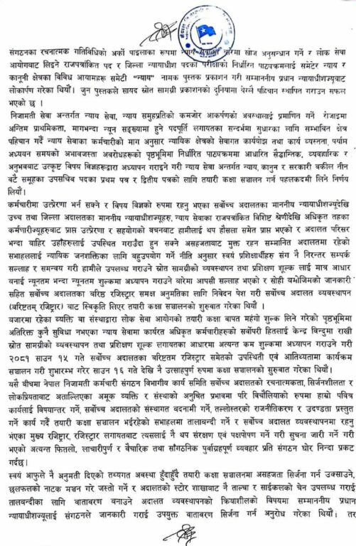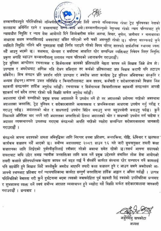 संगठनको विज्ञप्तिमा भनिएको छ, ‘सर्वोच्च अदालतबाट २०८१ साउन १६ गते जारी सूचनाअनुसार तयारी कक्षा सञ्चालनका लागि लिइएको पूर्व स्वीकृतिलाई स्वीकार गरेको अवस्था समेत रहेको छ । तसर्थ आफ्ना सदस्यको दायराबाट माथि उठेर समग्र न्यायिक जनशक्तिका लागि काम गर्ने प्रमुख उद्देश्यले सञ्चालित लोक सेवा आयोगको तयारी कक्षाले प्रतिस्पर्धात्मक श्रेष्ठता कायम गर्न मद्दत गर्छ नै सँगसँगै कार्यरत संस्थामा रहेर सम्पादन गर्ने कामलाई पनि सहयोगी हुने विश्वास लिँदै जस्तोसुकै अवरोध आएपनि तयारी कक्षा सञ्चालन हुने र आउन सक्ने अवरोधको आ–आफ्नो स्थानबाट प्रतिवाद गर्न न्यायपालिकामा कार्यरत सम्पूर्ण जनशक्तिमा हार्दिक आह्वान र अपिल गर्दछौँ । उत्पन्न परिस्थितिको बेवास्ता गरी कुनै दुर्घटना भएमा त्यसको जबाफदेहिता पूर्व सहमति दिई स्वयंको उपस्थितिमा धन्यवाद र शुभकामना व्यक्त गर्ने स्वयं सर्वोच्च अदालत व्यवस्थापन हुने ब्यहोरा यसै विज्ञप्ति मार्फत सरोकारवालामा जानकारी गराउँदछौँ ।’
