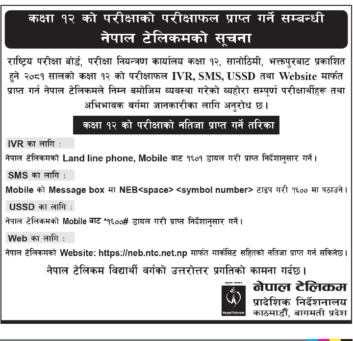 परीक्षाफल प्रकाशित भएपछि विभिन्न तरिकाबाट नतिजा हेर्न सकिन्छ । नेपाल टेलिकमका अनुसार आईभीआर, एसएमएस तथा वेबसाइटबाट समेत परीक्षाको नतिजा हेर्न सकिनेछ ।