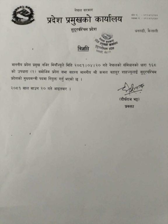 धनगढी । सुदूरपश्चिम प्रदेशको मुख्यमन्त्रीमा नेपाली कांग्रेसका संसदीय दलका नेता कमलबहादुर शाह नियुक्त भएका छन् । संविधानको धारा १६८ को उपधारा २ अनुसार कमलबहादुर शाहलाई मुख्यमन्त्रीमा नियुक्त भएका हुन् ।