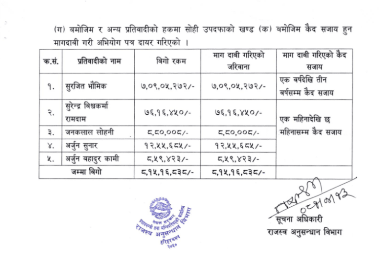 विभागले भौमकलाई ७ करोड ९ लाख ५ हजार २ सय ७२ बिगो रकम जरिवानासहित एक वर्ष देखि तीन वर्षसम्म कैद सजाय माग गरेको छ । त्यस्तै सुरेन्द्र विश्वकर्मा रामदामलाई ७६ लाख १६ हजार ५ सय ५० बिगो रकम जरिवानासहित ६ महिना कैद सजाय, जनकलाल लोहनीलाई ८ लाख ८० हजार ८ रुपैयाँ बिगोरकम जरिवानासहित ६ महिना कैद सजाय, अर्जुन सुनुवारलाई १२ लाख ५५ हजार ६ सय ८५ बिगो रकम जरिवानसहित ६ महिना कैद सजाय र अर्जुन बहादुर कामीलाई ८ लाख ५९ हजार ४ सय २३ रुपैयाँ बिगो रकमसहित ६ महिना कैद सजाय माग गरेको छ ।