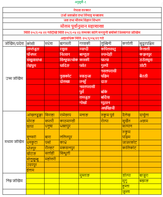 त्यस्तै देशका विभिन्न ४० जिल्लामा अत्यधिक वर्षाको सम्भावना रहेको महाशाखाले जनाएको छ । साथै ३६ जिल्लामा मध्ययम वर्षाको सम्भावना रहेको छ ।