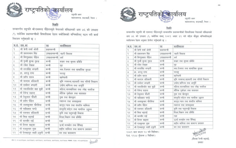 राष्ट्रपति रामचन्द्र पौडेलले बिहीबार विज्ञप्ति जारी गर्दै मन्त्रिपरिषद्का सदस्यहरुको मर्यादाक्रम हेरफेर गरेको जानकारी गराएका हुन् ।