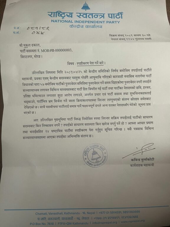 ‘अतः उल्लिखित पृष्ठभूमिमा पार्टी विरुद्ध नियोजित रुपमा निरन्तर सक्रिय तपाईंलाई पार्टीको साधारण सदस्यबाट किन निष्कासन नगर्ने ? तपाईंको साधारण सदस्यता किन खारेज नगर्नु पर्ने हो ? आफ्ना आधार प्रमाण तथा भनाईसहित २४ घण्टाभित्र पार्टीमा स्पष्टीकरण पेश गर्नुहुन सुचित गरिन्छ,’ रास्वपाले मुकुललाई पठाएको पत्रमा भनिएको छ ।