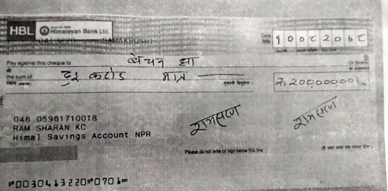 ‘म विगत ४ वर्ष देखि काठमाडौं जिल्ला का.म.न.पा.वडा नं.१० थापागाउँमा रहेको बेचन झाको श्रीमती चन्द्रिका झाले संचालन गरेको विभान्सु ब्रदर्श प्रालिमा मासिक तलब खाने गरी काम गर्दै आईरहेको छु । म उक्त प्रालिमा काम गर्दा मलाई बैंकमा गई चेक जम्मा गर्ने, रकम निकालेर ल्याउने र कम्पनीको अभिलेख राख्ने समेतको जिम्मेवारी दिएको थियो । यसै क्रममा हाल पक्राउ परी हिरासतमा रहेका बेचन झा म अफिसमा नै भएको अवस्थामा एकिन मिति थाहा भएन हाल बैंकबाट प्राप्त पत्र अनुसार मिति २०७८।०८।२३ गते बेचन झाले रामशरण केसीको नाममा हिमालयन बैंक लि.मा रहेको खाता नं.०४६०५९६१७१००१८ बाट जारी भएको चेक नं. ००३०४१३२२०।।०७०१।। मा बेचन झा र रकमको महलमा रु. २,००,००,०००।– लेखिएको चेक मलाई दिई सो चेक नेपाल इन्भेष्टमेण्ट बैंक लि. मा रहेको मेरो खाता नं.०१२०५०८०३६५६९७ मा जम्मा गरिदिनु भनि मलाई दिएकोले मैले सो चेक निज बेचन झाले भनेको खातामा लगि चेक भुक्तानीको लागि पेस गरेको हुँ । सो चेक जम्मा गरेको भौचर मैले बेचन झालाई दिएकोमा सो चेक जम्मा गरेको भोलिपल्ट चेक साटिएन फिर्ता लिन आउनु भनि बैंकबाट मलाई फोन गरी बोलाएकोले म बैंकमा गई मैले बेचन झाको खातामा जम्मा गरेको रु. २,००,००,०००।– को चेक फिर्ता ल्याई बेचन झालाई दिएको हुँ । उक्त चेक बेचन झाले के कहाँबाट, कोसँग, के प्रयोजनका लागि ल्याएका हुन मलाई थाहा भएन । हाल जिल्ला प्रहरी परिसर भद्रकालीबाट मलाई फोन गरी चेकको विषयमा मलाई सोधपुछ गर्दा उक्त चेक बेचन झाले राम शरण केसीबाट लिएको भन्ने कुरा थाहा पाएको हुँ । अन्य कुरा मलाई थाहा भएन ।’