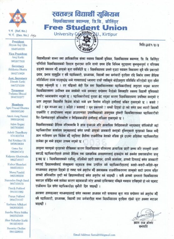 ‘…आफूमा पलाएको सुरक्षाको सौखिनका कारण विश्वविद्यालय परिषद्मा अत्याधिक प्रहरी जम्मा गरी रणभूमीजस्तो बनाउँदे पदाधिकारीहरुले आफ्नो शैक्षिक तथा प्रशासनिक असक्षमतालाई ढाकछोप गर्न अनर्गल प्रचारबाजीमा जानु दुखद छ । विश्वविद्यालयको स्ववियु, नजिकैको प्रहरी प्रशासन, आफ्नै कार्यालय, आफ्नो टीमलाई समेत जानकारी नगराई शिक्षामन्त्रीलाई फेसबुकमा स्टयाटस लेख्न उत्प्रेरित गर्ने पदाधिकारीहरुलई कसले ? कसरी ? कहिले ? कुन ? माध्यमबाट असुरक्षा दिएको हो स्पष्ट पार्न अनुरोध गर्दै अनावश्यक राजनीतिकरणमा लाग्नुको साटो प्रमाणसहित आफ्नो अभिव्यक्ति पुष्टि गर्न शिक्षामन्त्रीलाई समेत अनुरोध गर्न चाहान्छौँ । साथै आफ्नो क्षमताले विश्वविद्यालय चलाउन सकिँदैन भन्ने लागेका कारण बहानाबाजी गरेर आफ्नो दायित्वबाट पन्छिने मनसाय राखिएको हो भने पदबाट राजीनामा दिन समेत पदाधिकारीहरुलाई चुनौती दिन चाहान्छौँ,’ जारी विज्ञप्तिमा भनिएको छ ।