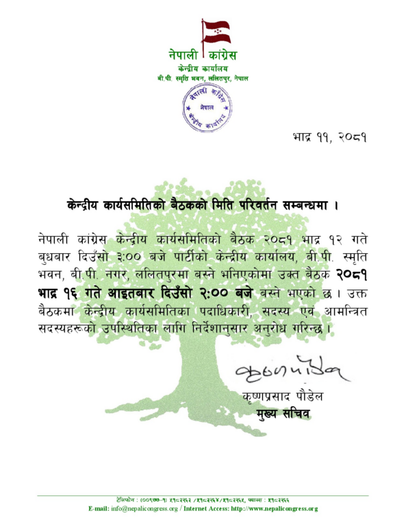 बुधबार (भोलि) दिउँसो ३ बजेका लागि बोलाइएको बैठक आगामी भदौ १६ गतेसम्मका लागि स्थगित गरिएको कांग्रेस मुख्यसचिव कृष्णप्रसाद पौडेलले जानकारी दिए ।