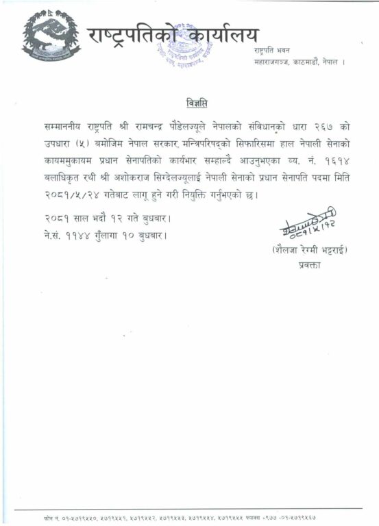 काठमाडौं । नेपाली सेनाका बलाधिकृत रथी अशोकराज सिग्देल प्रधानसेनापतिमा नियुक्त भएका छन् । राष्ट्रपति रामचन्द्र पौडेलले कायममुकायम प्रधानसेनापतिको काम गर्दै आएका सिग्देललाई बुधबार प्रधानसेनापतिमा नियुक्त गरेका हुन् ।