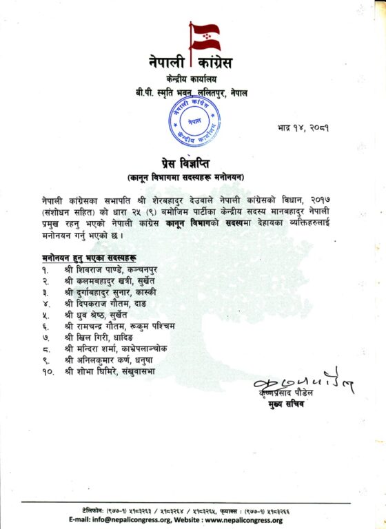 काठमाडौं । नेपाली कांग्रेसको कानुन विभागमा १० सदस्यहरु मनोनित भएका छन् ।