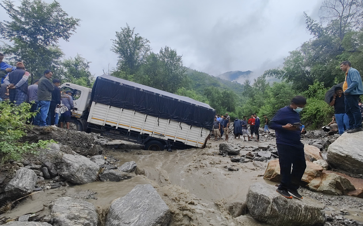 आइतबार सिन्धुलीको फिक्कल गाउँपालिका वडा नं ४ खाङ्साङ बेसी खोलामा अबिरल वर्षाको कारण आएको बाढीमा मालबाहक ट्रक फस्दा सडक अवरुद्ध भएको हो ।