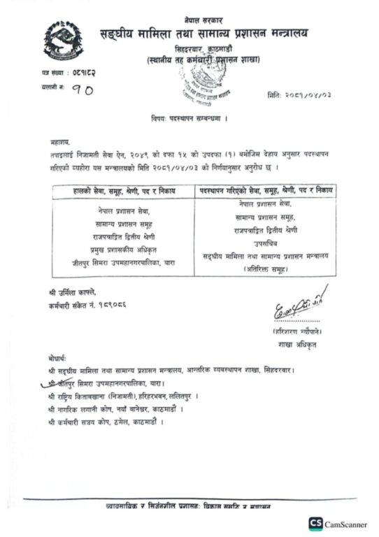 सर्वोच्च अदालतले गत साउन १० गते जीतपुर सिमराकी प्रमुख प्रशासकीय अधिकृतका रुपमा रहेकी काफ्लेलाई सरुवा नगर्न अल्पकालीन अन्तरिम आदेश जारी गरेको थियो ।