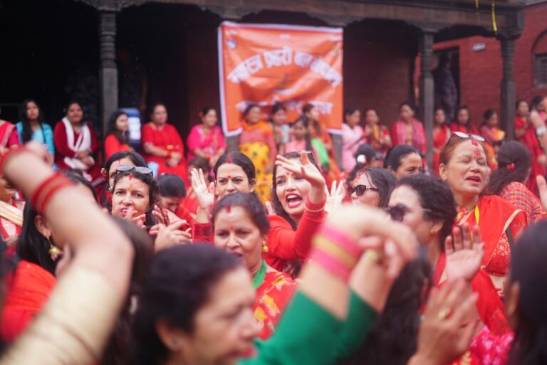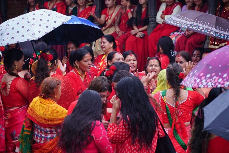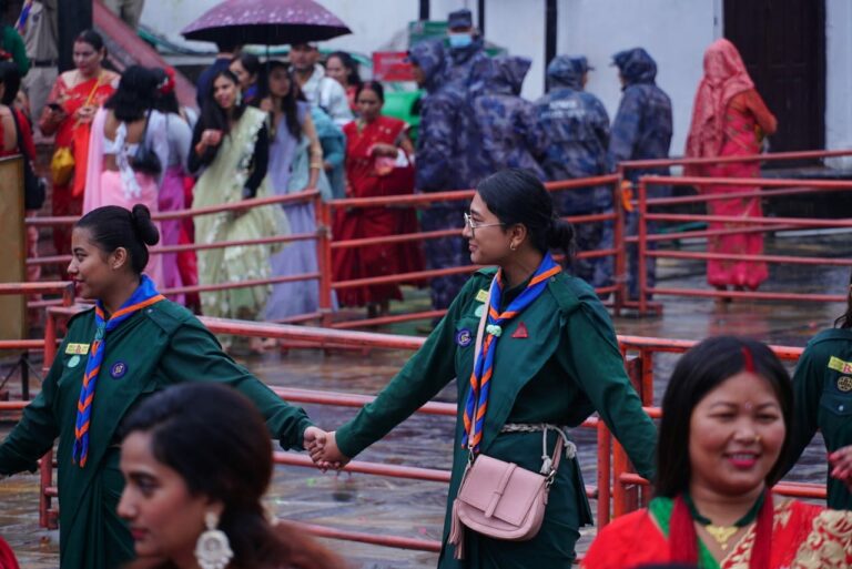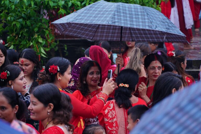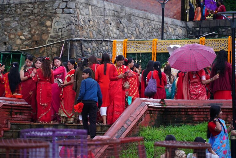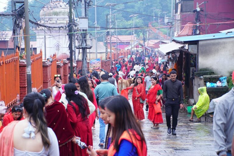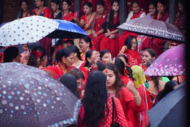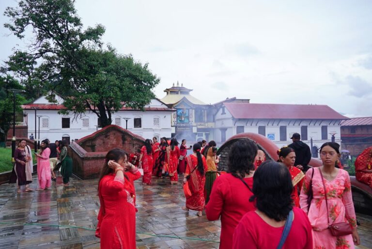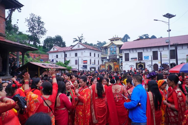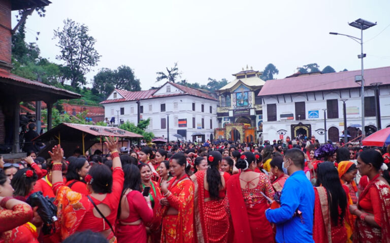 काठमाडौं । पशुपति क्षेत्रमा तीजको रौनक देखिएको छ । बिहानैबाट पशुपति क्षेत्रमा बाक्लो रुपमा महिला दिदीबहिनीहरुको उपस्थिती देखिएको छ । आज बिहानैबाट वर्षा भए पनि छाता ओडेर महिलाहरु नाचगानमा व्यस्त देखिन्छन् ।