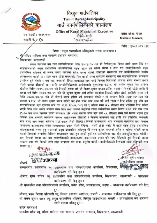 ‘…निजको (ललनकुमार यादव) हालसम्मको कार्यकाल अत्यन्त सन्तोषजनक देखिएको र निजको कामकाजबाट हामी जनप्रतिनिधि, कर्मचारी मात्र नभई आम जनता समेतमा राम्रो प्रभाव परेको देखिन्छ । निजको कार्यकालमा आम जनताको कामकाज तथा विकास निर्माणको कामकाज समेत सकारात्मक प्रभाव परेको देखिन्छ । यसरी छोटो अवधिमै पटकपटक प्रमुख प्रशासकीय अधिकृतहरुको सरुवा हुनु र हालको प्रमुख प्रशासकीय अधिकृत श्री ललनकुमार यादवको समेत ४ महिना नबित्दै सरुवा भएको विषयको सन्दर्भमा विभिन्न माध्यमबाट थाहा हुन आएको हुँदा यस कार्यपालिकाबाट घोर असन्तुष्टि प्रकट गर्दछौँ,’ मन्त्रालयलाई पठाइएको पत्रमा भनिएको छ ।
