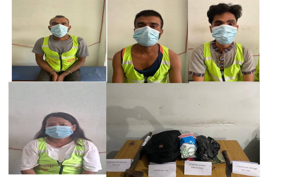 यसको साथै उनीहरुको साथबाट प्रहरीले घटनामा प्रयोग गरेको बन्चरो १ थान, खुकुरी एक थान र मासु बोक्न प्रयोग भएको झोला एक थान पनि बरामद गरेकाे छ ।