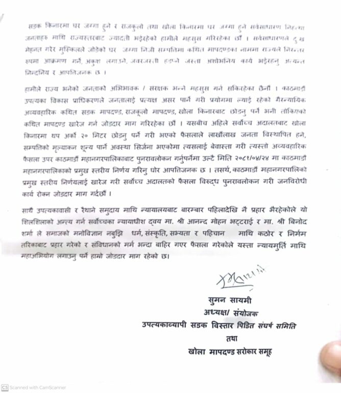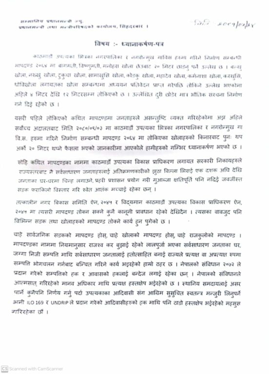 सोमबार उपत्यकाव्यापी सडक विस्तार पीडित संघर्ष समिति तथा खोला मापदण्ड सरोकार समूहले प्रधानमन्त्री केपी शर्मा ओलीको ध्यानाकर्षण गराएको हो ।
