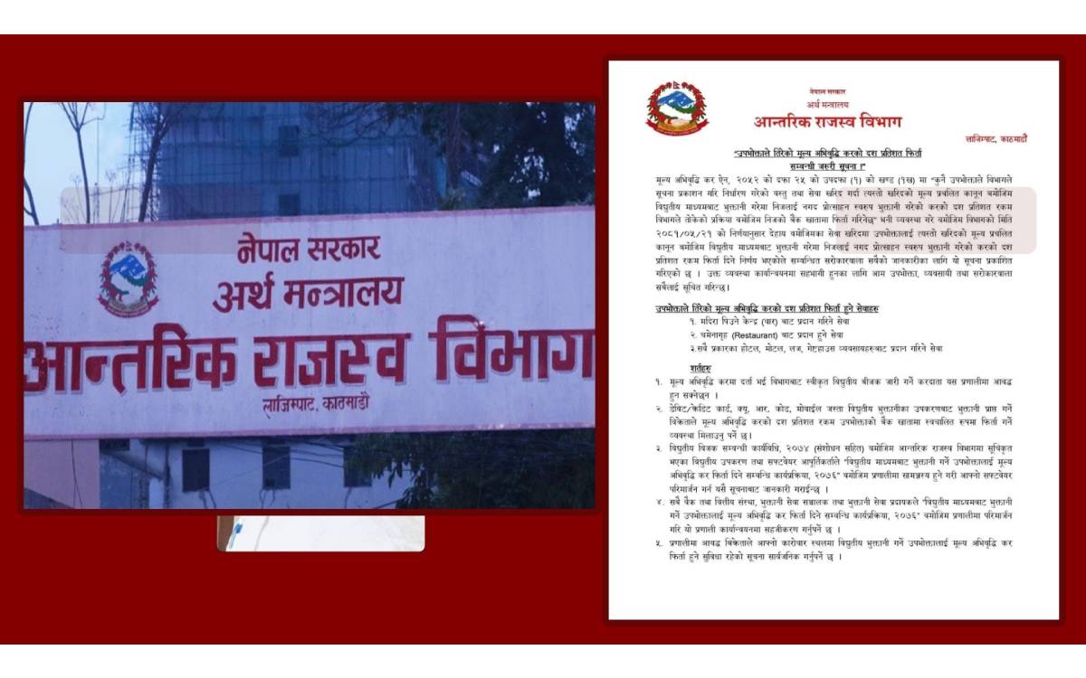 विभागले जारी गरेको सूचनामा भनिएको छ,‘अभिवृद्धि कर ऐन, २०५२ को दफा २५ को उपदफा (१) को खण्ड (ख) मा कुनै उपभोक्ताले विभागले सूचना प्रकाशन गरी निर्धारण गरेको वस्तु तथा सेवा खरिद गर्दा त्यस्तो खरिदको मूल्य प्रचलित कानुन बमोजिम विद्युतीय माध्यमबाट भुक्तानी गरेमा निजलाई नगद प्रोत्साहन स्वरूप भुक्तानी गरेको करको दश प्रतिशत रकम विभागले तोकेको प्रक्रिया बमोजिम निजको बैंक खातामा फिर्ता गरिनेछ ।’ उक्त निर्णय भदौ २१ गते शुक्रबार गरिएको थियो ।