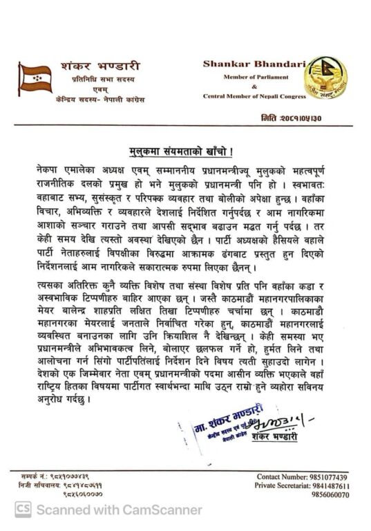 ‘काठमाडौं महानगरका मेयरलाई जनताले निर्वाचित गरेका हुन्, काठमाडौं महानगरलाई व्यवस्थित बनाउनका लागि उनी क्रियाशील नै देखिन्छन् । केही समस्या भए प्रधानमन्त्रीले अभिभावकत्व लिने, बोलाएर छलफल गर्ने, हुर्मत लिने तथा आलोचना गर्न सिंगो पार्टीपंक्तिलाई निर्देशन दिने विषय त्यति सुहाउँदो लागेन । देशको एक जिम्मेवार नेता एवम् प्रधानमन्त्रीको पदमा आसिन व्यक्ति भएकाले वहाँ राष्ट्रिय हितका विषयमा पार्टीगत स्वार्थभन्दा माथि उठ्न राम्रो हुने व्यहोरा सविनय अनुरोध गर्दछु,’ जारी विज्ञप्तिमा भनिएको छ ।