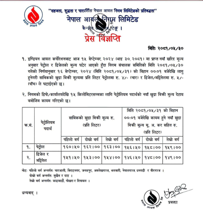 आज रातिको १ बजेबाट उक्त मूल्य लागू हुनेछ ।