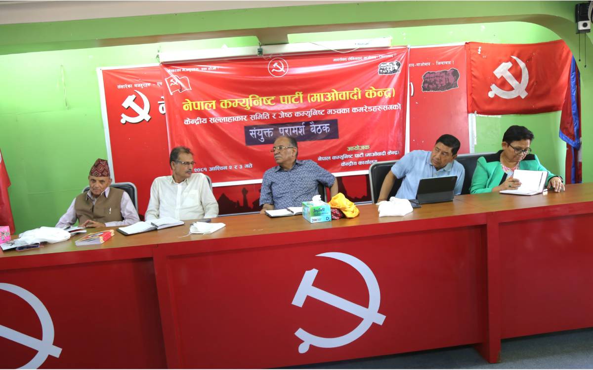 काठमाडौं । नेकपा माओवादी केन्द्रको केन्द्रीय सल्लाहकार समिति र ज्येष्ठ कम्युनिष्ट मञ्चको संयुक्त परामर्श बैठक पार्टी कार्यालय पेरिस डाँडामा सुरु भएको छ ।