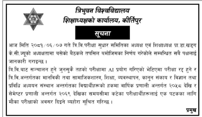 त्यस्तै, सेमेष्टर प्रणाली अन्तरगत ०६९ देखि समयसीमा कटेका परीक्षाथीहरुले पनि मौका परीक्षा दिन पाउने भएका छन् । त्यसैगरी त्रिविले जुनसुकै तहको परीक्षामा एआई प्रयोग गरिएको भेटिएमा परीक्षा रद्द गरिने जनाएको छ ।