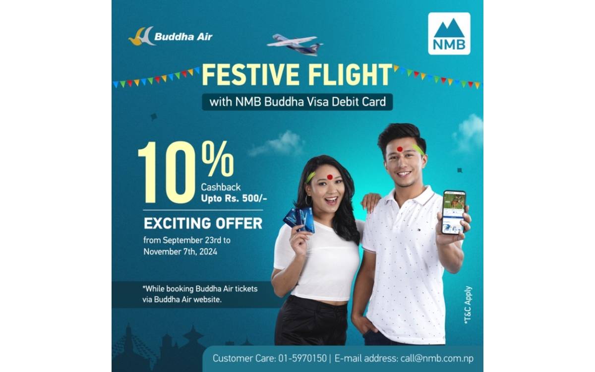 काठमाडाैं । एनएमबि बैंकले बुद्ध भिसा कार्डबाट फ्लाइट टिकेट किन्ने ग्राहकका लागि १० प्रतिशत छुट प्रदान गर्ने भएको छ ।
