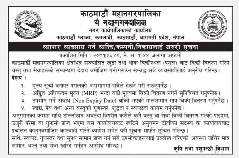 महानगरपालिकाले आफ्नो क्षेत्रभित्र सञ्चालित खुद्रा तथा थोक बिक्रेताहरूका लागि आज एक सूचना जारी गर्दै यस बारेमा जानकारी गराएको हो ।