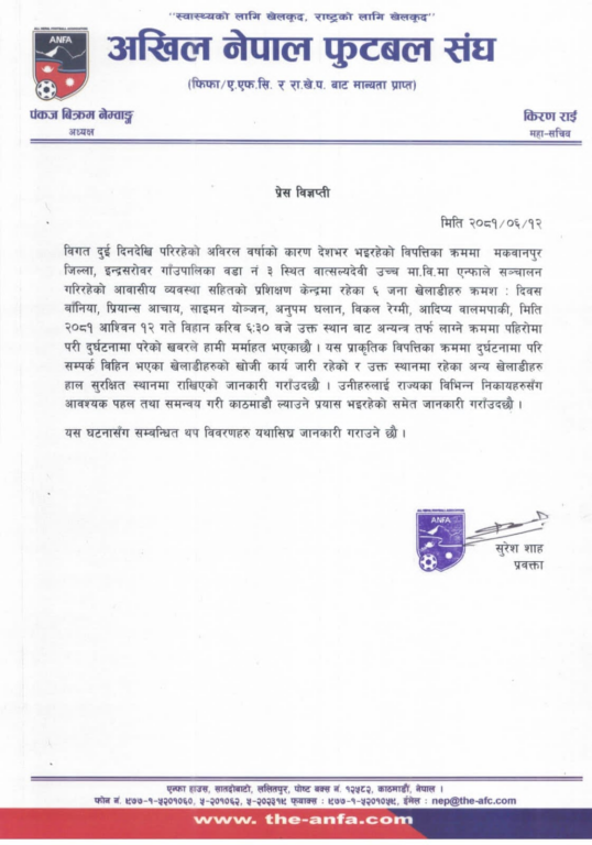 हेटौँडा । मकवानपुर सिस्नेरीमा रहेको अखिल नेपाल फुटबल संघ (एन्फा) एकेडेमीका ६ जना खेलाडी पहिरोमा परी बेपत्ता भएका छन् ।