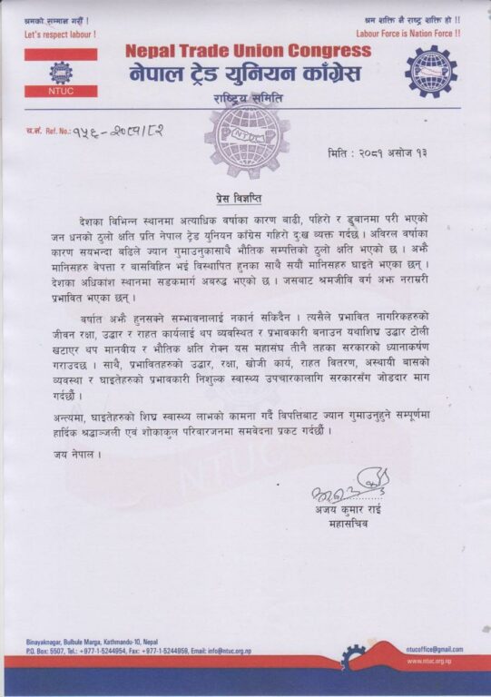 काठमाडौं । नेपाल ट्रेड युनियन कांग्रेसले बाढी पहिरो प्रभावित श्रमिक एवं नागरिकहरूको जीवन रक्षा, उद्धार र राहत कार्यलाई प्रभावकारी बनाउन माग गरेको छ ।