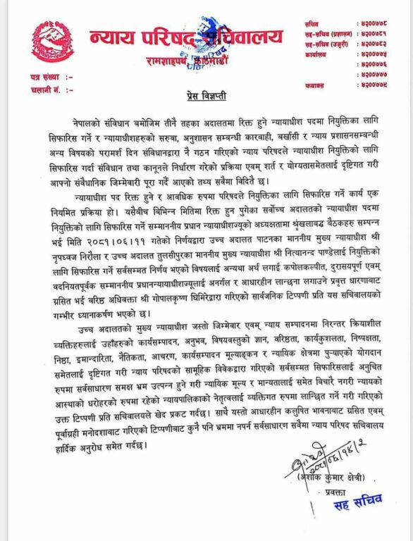 घिमिरेका अभिव्यक्तिलाई लिएर न्याय परिषद्को सचिवालयले विज्ञप्तिमार्फत आपत्ति जनाएको छ ।सर्वोच्च अदालतको न्यायाधीशमा नृपध्वज निरौला र नित्यानन्द पाण्डेको सिफारिसका विषयलाई लिएर घिमिरेले सार्वजनिक अभिव्यक्ति दिएका थिए ।