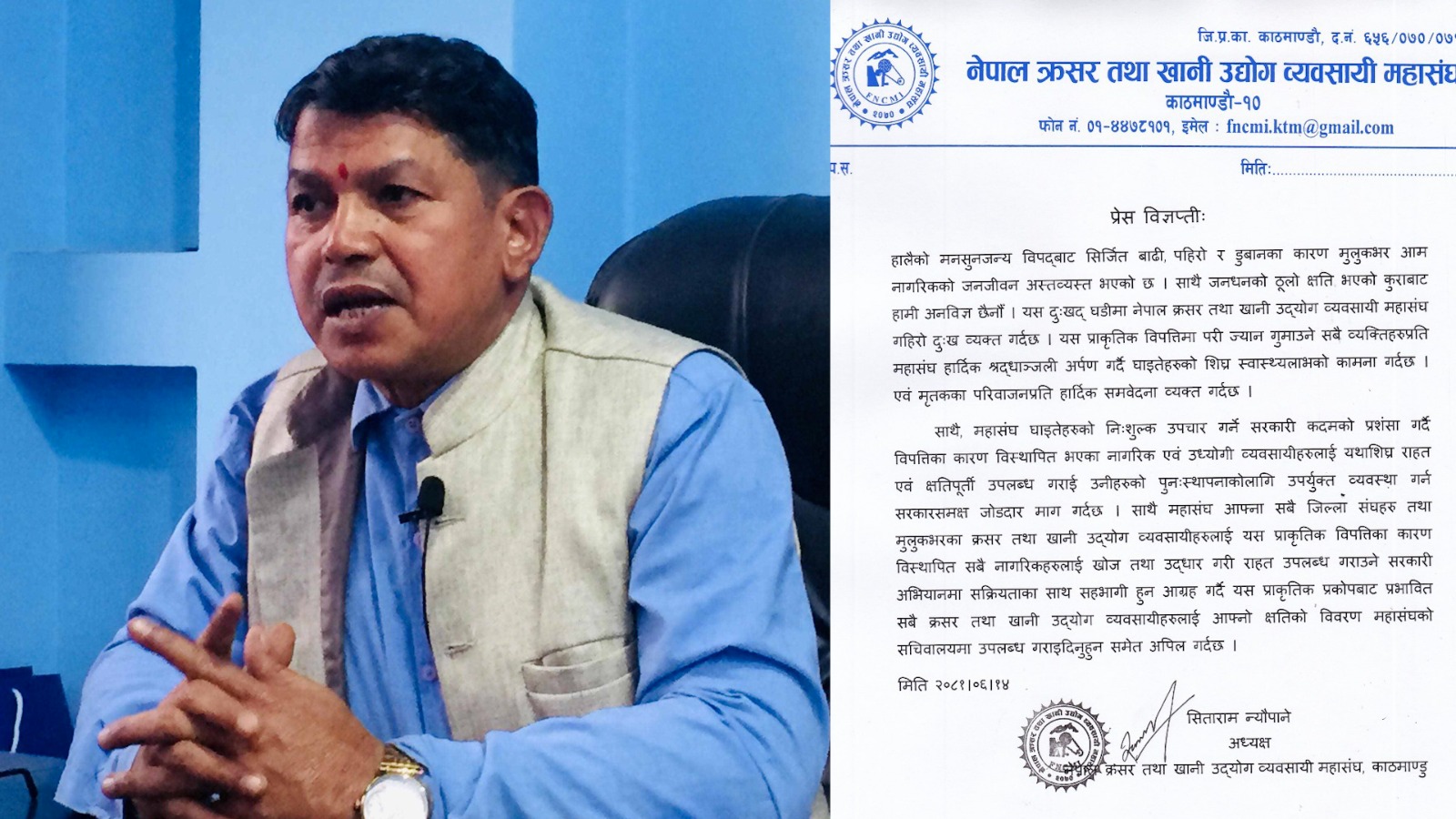 महासंघका अध्यक्ष सिताराम न्यौपानेद्वारा विज्ञप्तिमा भनिएको छ, ‘हालैको मनसुनजन्य विपद्बाट सिर्जित बाढीपहिरो र डुवानका कारण मुलुकभर आम नागरिकको जनजीवन अस्तव्यस्त भएको छ । साथै जनधनको ठुलो क्षति भएको कुराबाट हामी अनविज्ञ छैनौँ । यस दुःखद घडीमा नेपाल क्रसर तथा खानी उद्योग व्यवसायी महासंघ गहिरो दुःख व्यक्त गर्दछ । यस प्राकृतिक विपत्तिमा परी ज्यान गुमाउने सबै व्यक्तिहरुप्रति महासंघ हार्दिक श्रद्धाञ्जली अर्पण गर्दै घाइतेहरुको शिघ्र स्वास्थ्यलाभको कामना गर्दछ । साथै मृतकका परिवाजनप्रति समवेना व्यक्त गर्दछ । महासंघ घाइतेहरुको निःशुल्क उपचार गर्ने सरकारी कदमको प्रशंसा गर्दै विपत्तिका कारण विस्थापित भएका नागरिकहरुलाई यथाशिघ्र राहत उपलब्ध गराई उनीहरुको पुनःस्थापनाको उपयुक्त व्यवस्था गर्न सरकारसमक्ष जोडदार माग गर्दछ । साथै महासंघ आफ्ना सबै जिल्ला संघहरु तथा मुलुकभरका क्रसर तथा खानी उद्योग व्यवसायीहरुलाई यस प्राकृतिक विपत्तिका कारण विस्थापित सबै नागरिकहरुलाई खोज तथा उद्धार गरी राहत उपलब्ध गराउने सरकारी अभियानमा सक्रियताका साथ सहभागी हुन आग्रह गर्दै यस प्राकृतिक प्रकोपबाट प्रभावित सबै क्रसर तथा खानी उद्योग व्यवसायीहरुलाई आफ्नो क्षतिको विवरण महासंघको सचिवालयमा उपलब्ध गराइदिनुहुन समेत अपिल गर्दछ ।’