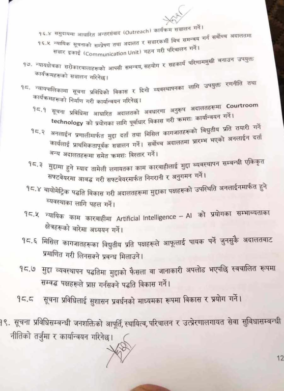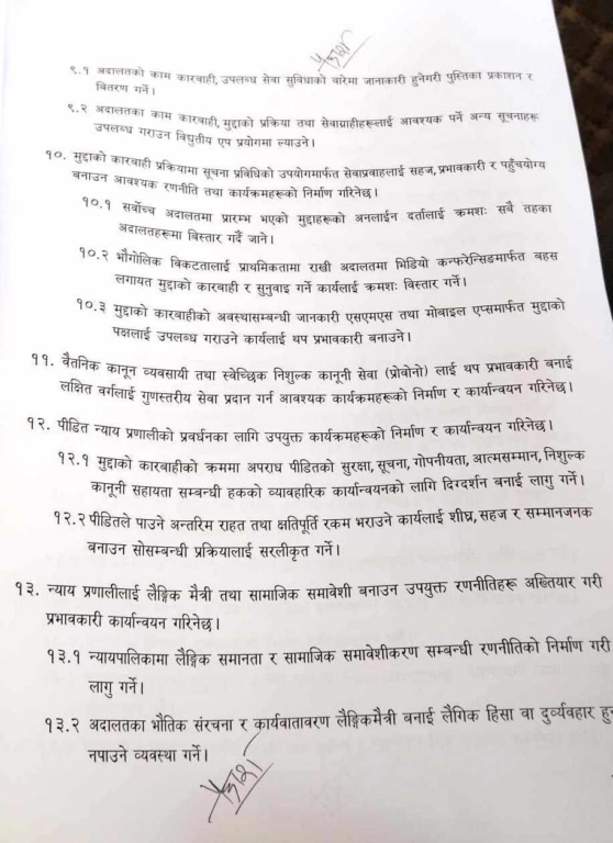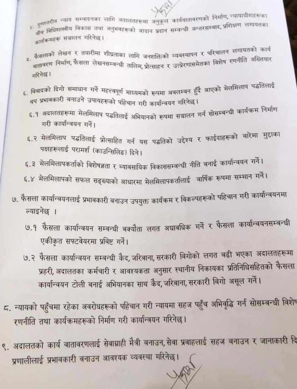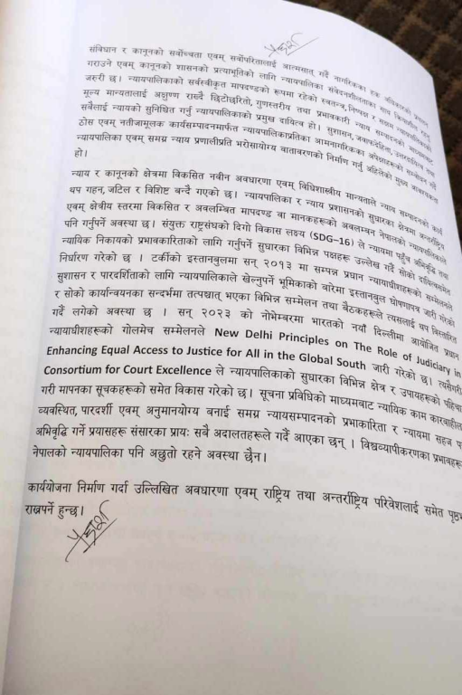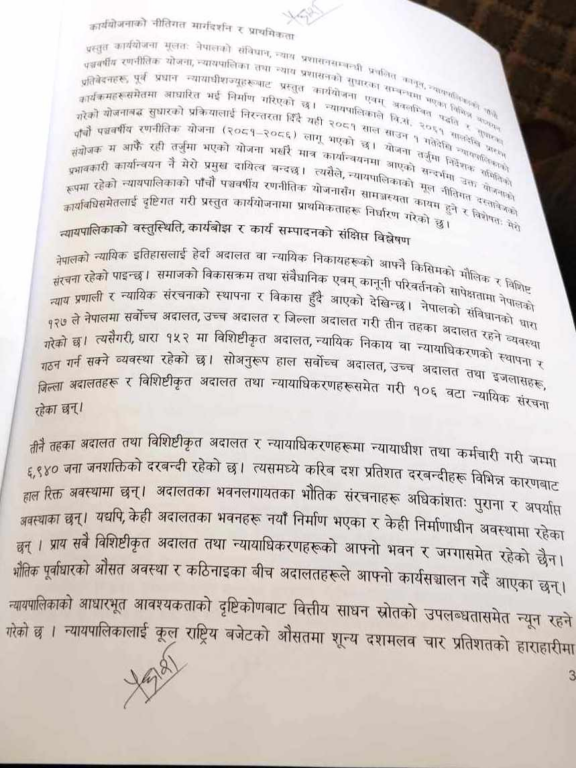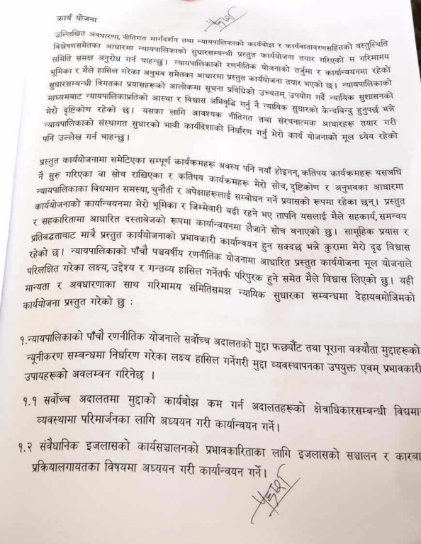 ‘संविधान र कानुनको सर्वोच्चता र सर्वोपरितालाई आत्मसाथ गर्दै नागरिकको हक अधिकारको प्रचलन गराउने एवं कानुनको शासनको लागि न्यायापालिकाको क्रियाशीलता रहनु जरुरी रहेको छ,’ उनले आफ्नो कार्ययोजना प्रस्तुत गर्दै भने, ‘न्यायपालिकाको सर्वस्वीकृत मापदण्डको रुपमा रहेको स्वतन्त्र निष्पक्ष र सक्षम न्यायापालिकाको मूल्यमान्यतालाई अक्षुण राख्दै छिटो छरितो गुणस्तरीय र प्रभावकारी न्याय सम्पादनको माध्यमबाट सबैलाई न्यायको सुनिश्चित गर्नु न्यायपालिकाको प्रमुख दायित्व हो ।’